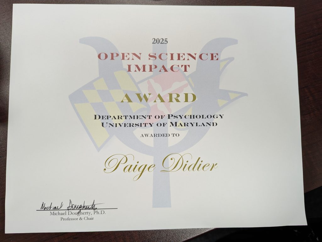 A hearty congratulations to Ph.D. study Paige Didier on receiving the Department of Psychology’s Open Science award for her master’s project. You can learn more about the project and Paige’s open science practices here.
